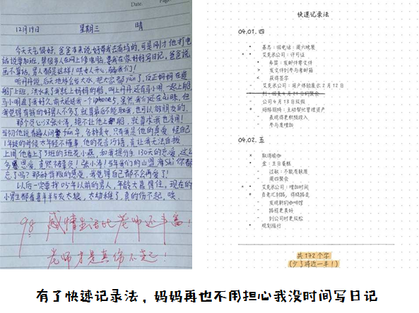 很多同学会抱怨,工作太忙了我哪有那么多时间像个18岁花季少女来写啥日记。这你就有所不知:子弹笔记的快速记录法能让你快速捕获和解析所有的事实、信息和数据。它可以包容任何内容,比如习惯跟踪、观影清单、读书清单、项目跟踪等一切都可以放进去。搞清楚这一点将有助于更有效地集中你的时间和精力,不用洋洋洒洒写很多字的笔记随感,只需要用简短的记号、人物+动词+名词短句,就能高效同步捕捉记录生活。(下图可以清楚看出对比)