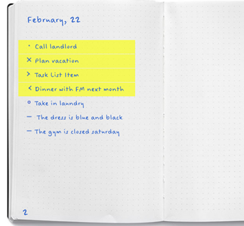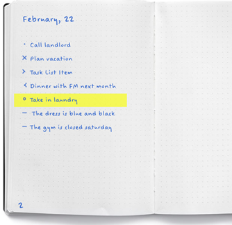 任务子弹用一个小圆点“•”来标识,用来标识任务需要去行动的任务,比如“参加会议”、“取干洗的衣服”。任务子弹在子弹日记中非常重要,它又分为三种: