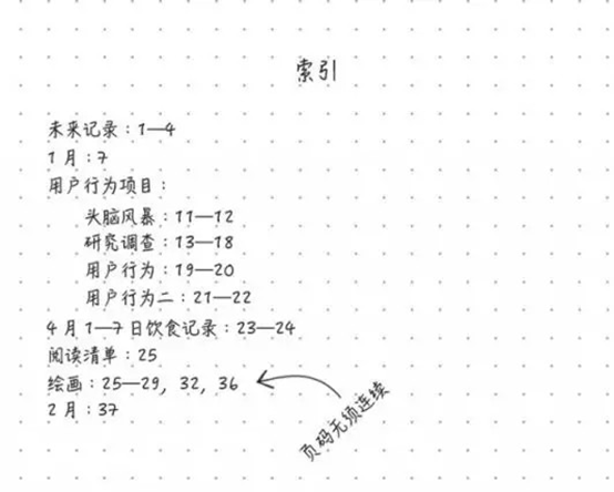 子弹笔记要求在笔记的最开始由我们手工打造一个索引目录,将标题及其对应页码写入索引中,索引可以用来收集被中断或打散的主题,并且我们进行回顾。
