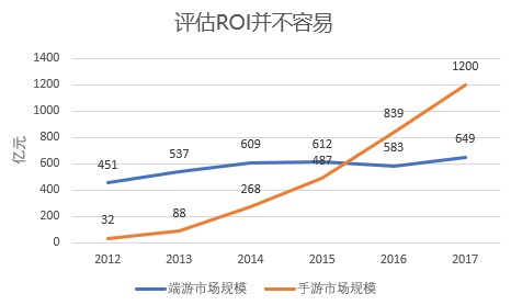 ROI这个道理看似简单,但预测ROI并不容易。看看这张图,橙色这条线是中国手游市场的增速,蓝色是端游的。在2012、2013年,手游市场规模很小,增速虽然很快,但是相比端游总量差距实在太大。这个时候老牌的端游公司对于是否应该进入手游市场,应该投入多少资源是充满疑惑的。当时网易做了一个非常正确的战略决策,花很多力气推动工作室去做手游,最终奠定了今天在手游市场的成功。